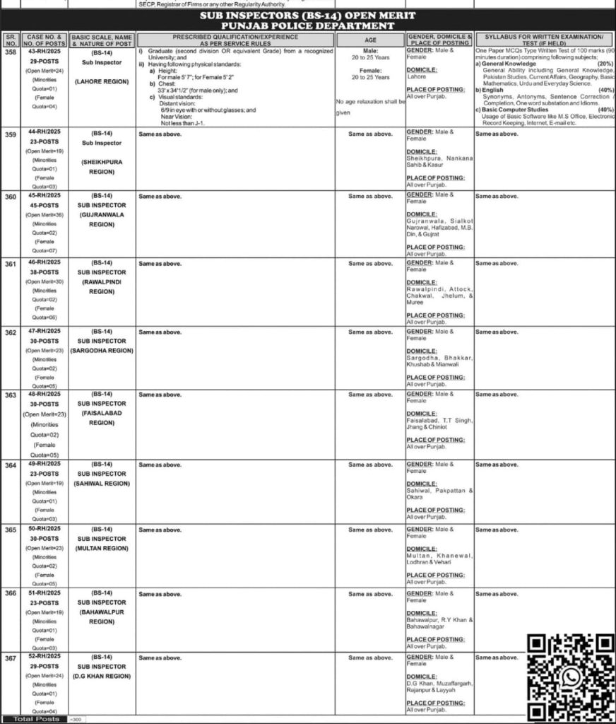 The Punjab Police Sub Inspector (BS-14) Jobs 2025 are an excellent opportunity for both male and female graduates to join the police department. With a total of 299 vacancies in different regions of Punjab, candidates should prepare themselves for the written test, physical standards, and interview. Interested applicants must apply online through the PPSC portal before 02 October 2025.