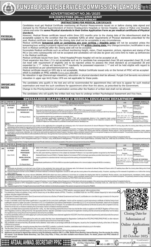 The Punjab Public Service Commission (PPSC) has announced new vacancies for the post of Sub Inspector (BS-14) in the Punjab Police Department. These jobs are a great chance for educated youth of Punjab who want to join the police force, serve the nation, and build a strong career. The positions are announced under Advertisement No. 36/2025 and are open for both male and female candidates.